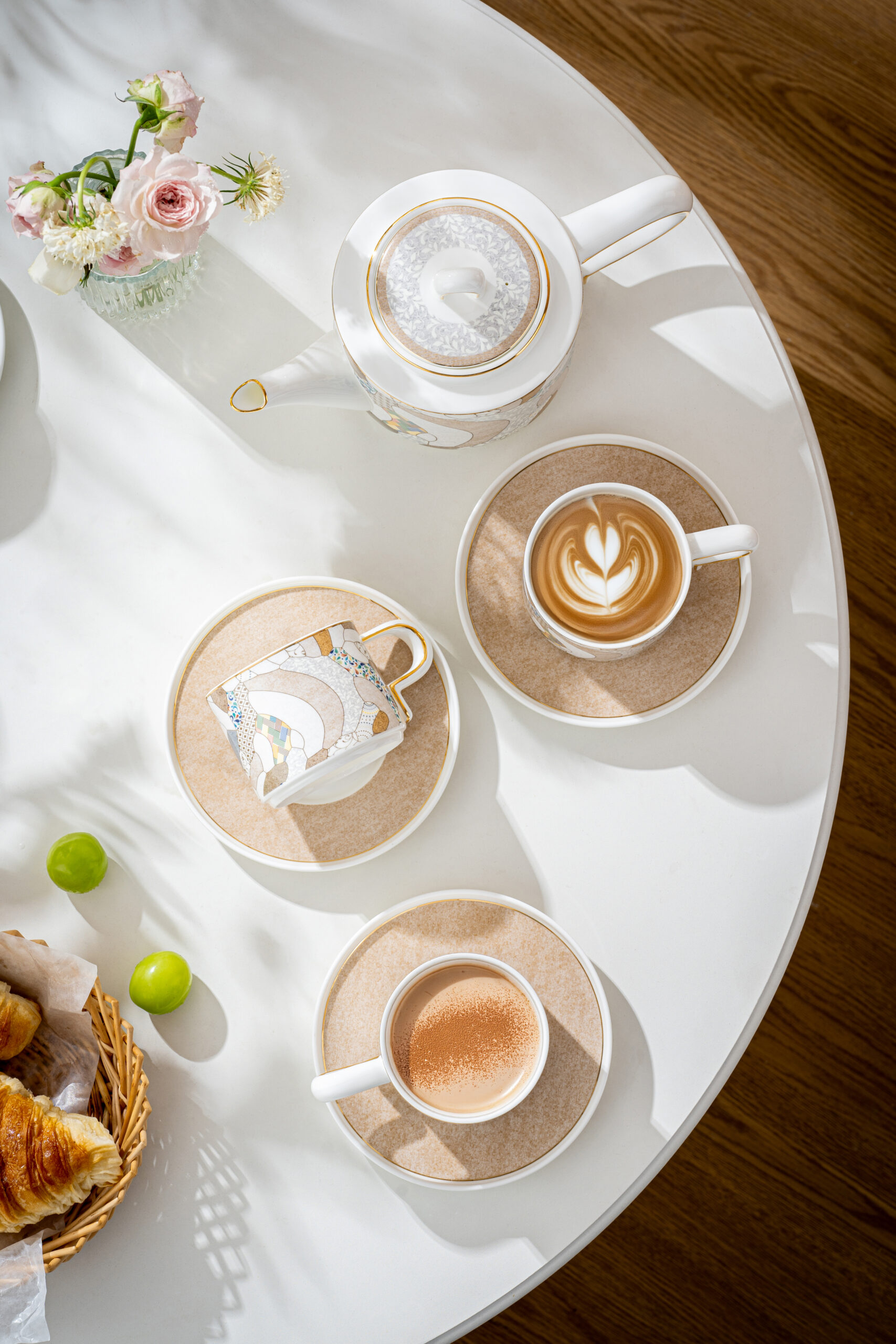 • 4 premium bone china coffee cups with matching saucers